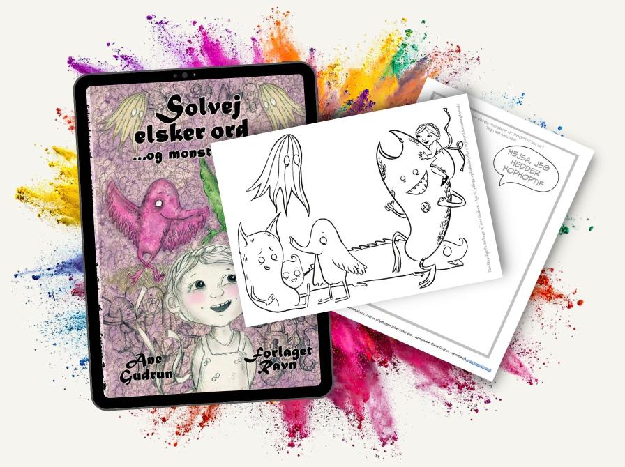 - Hent malebog og opgaver til "Solvej elsker ord ... og monstre", print det antal male- og opgaveark, I skal bruge, og find farveblyanter frem.